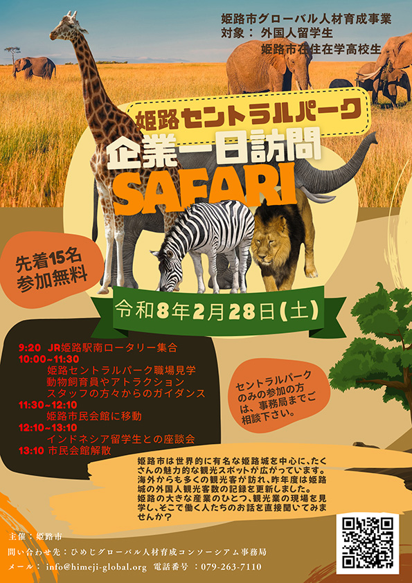 2/28当日は姫路駅南口ロータリに集合、姫路セントラパークに行き、サファリバスで動物を見学しながら、社員の方のお仕事の説明を伺います。その後、新しい乗り物「ヴィーナスGP」を体験、遊園地を見学します。